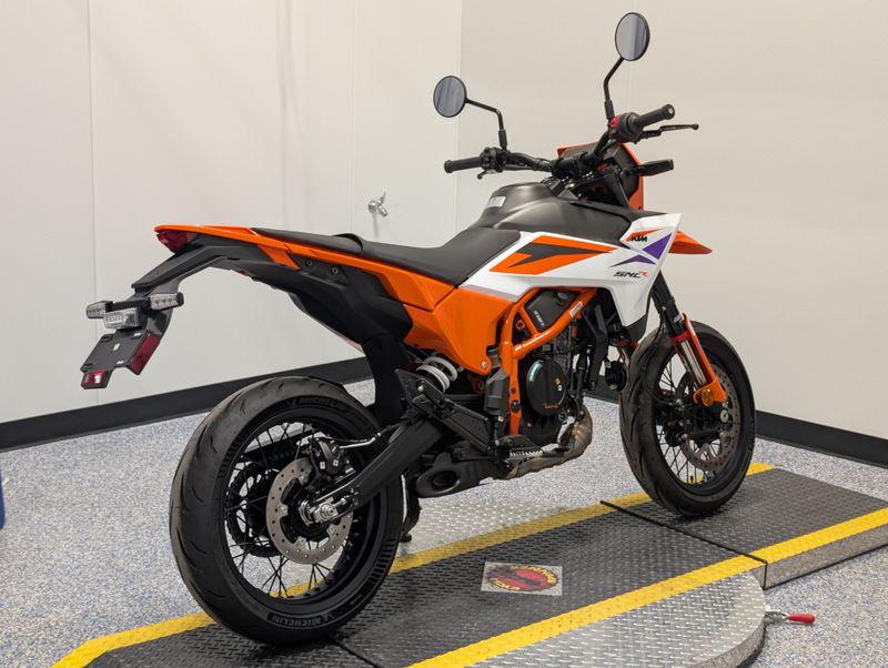 The KTM 390 SMC R (2025/2026 model) is a lightweight, aggressive supermoto built for fun on asphalt and dirt, featuring a 399cc single-cylinder engine (44hp), fully adjustable WP Apex suspension, and street-focused Michelin tires on 17-inch spoked wheels, with modern electronics like riding modes, switchable traction control, and a TFT dash, offering approachable performance for new riders or experienced enthusiasts wanting a nimble, stunt-capable street machine.