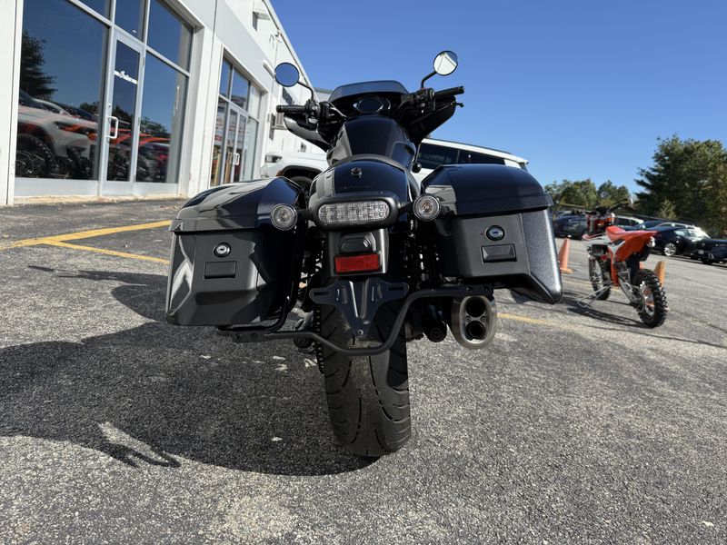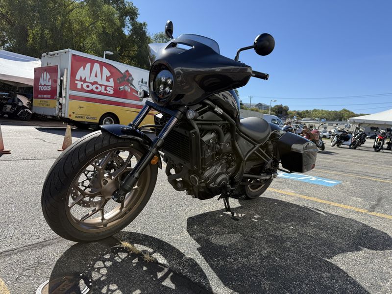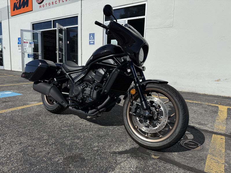 The 2024 Honda CMX1100D2 Rebel 1100T DCT is a blacked-out, modern cruiser "bagger" featuring a powerful 1083cc parallel-twin engine, standard hard saddlebags, a batwing fairing for wind protection, and an available automatic Dual-Clutch Transmission (DCT) for effortless riding. It blends cruiser style with modern tech like ride modes, cruise control, and an LCD dash, offering strong low-end torque and versatile performance with easy maneuverability, making it suitable for long rides or daily commutes.