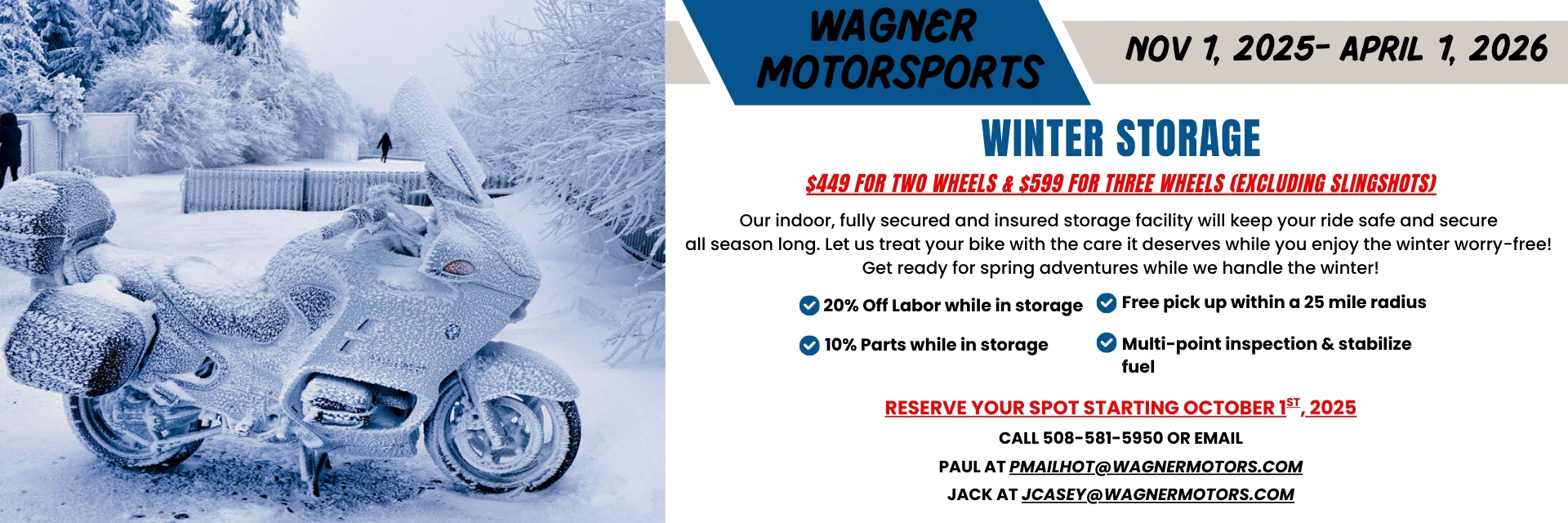 Indoor, fully secured and insured storage is available for your motorycle at Wagner Motorsports. Our storage season runs from November 1st to April 1st , and spots will fill up quickly so don’t delay!